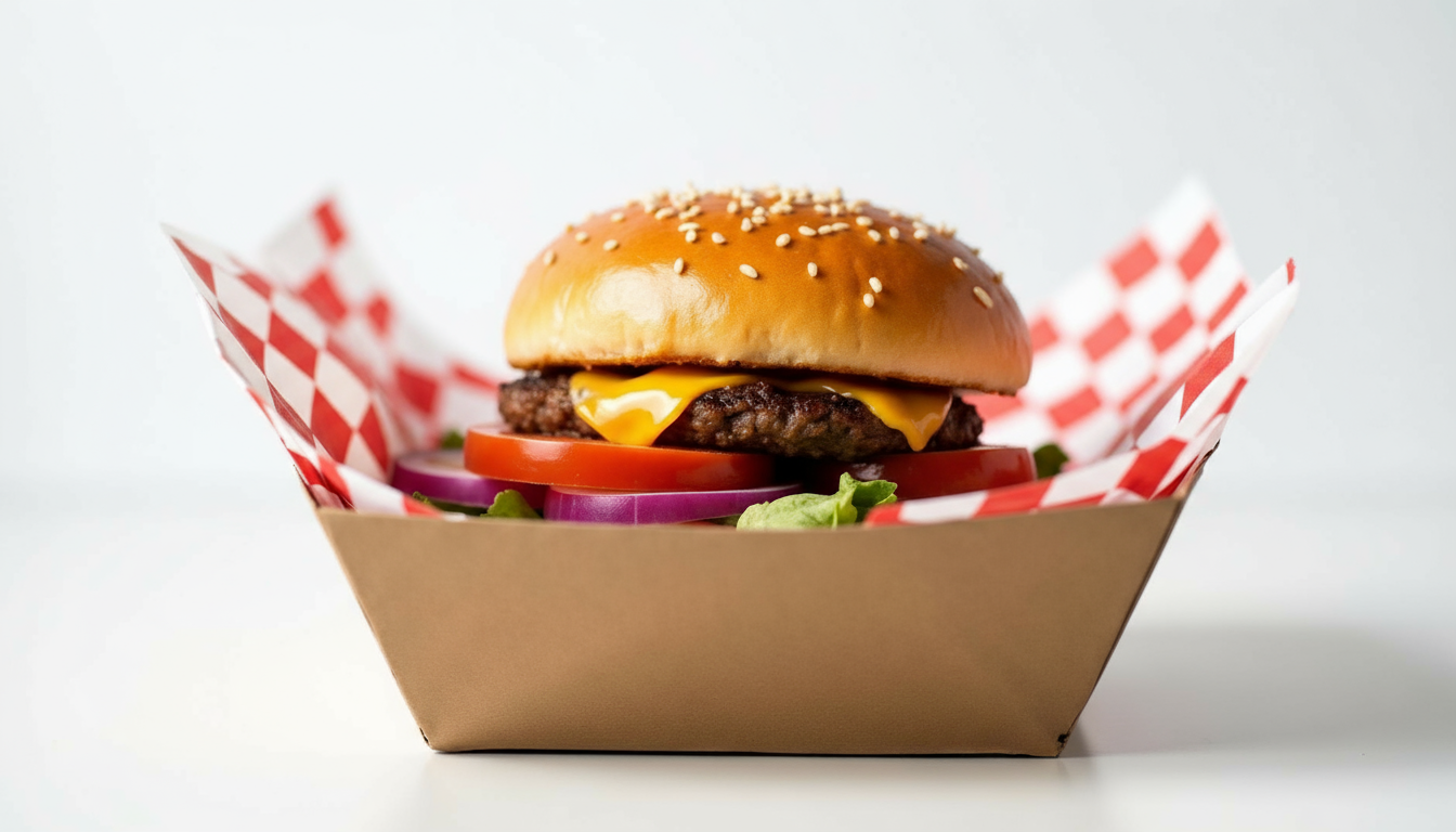 Eco-friendly kraft burger box for burgers and snacks, which are durable & grease-resistant.